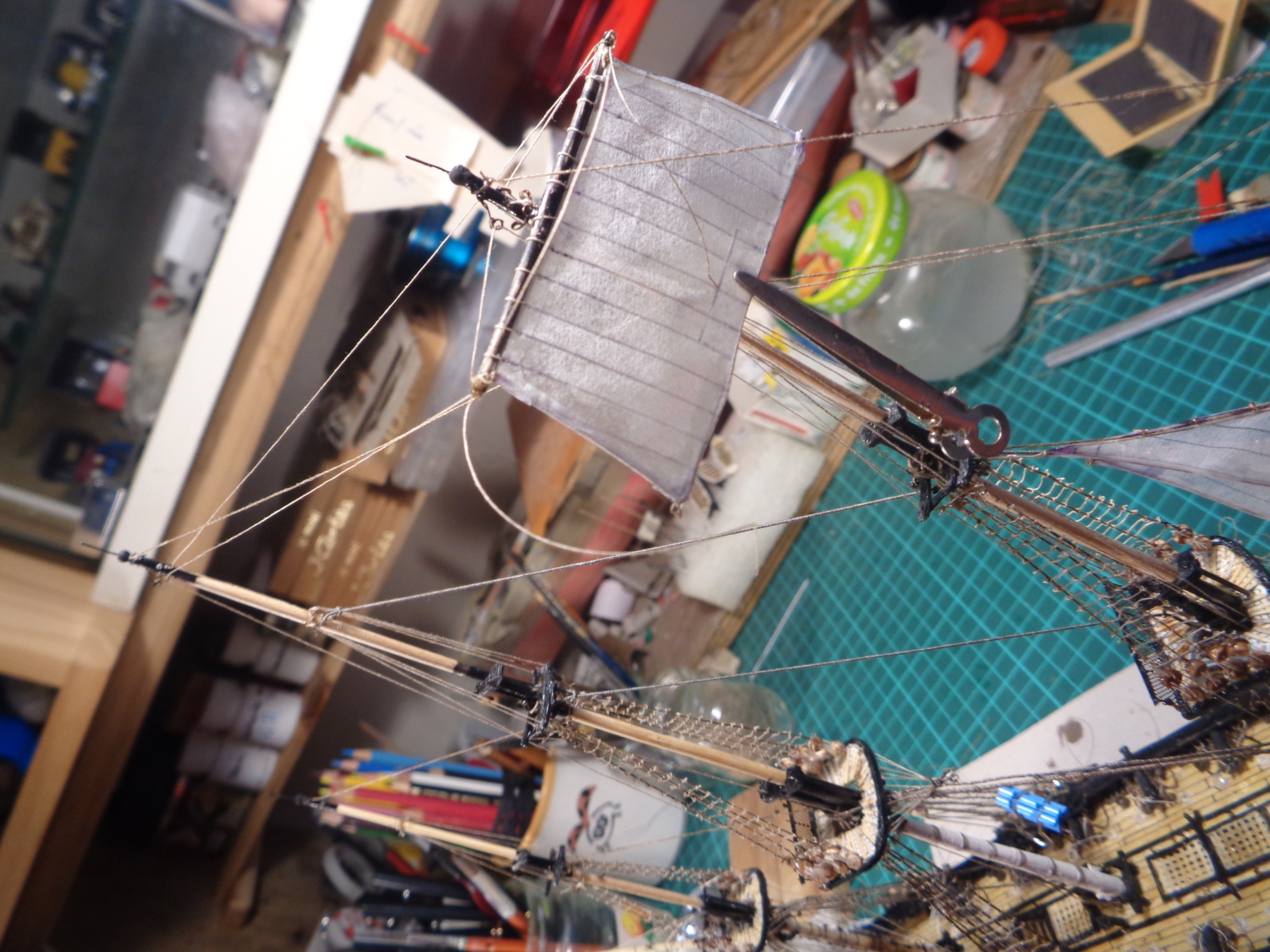 Voici où j'en suis. Demain, je complète le gréement du petit perroquet, et j'espère préparer le petit hunier et le fixer sur sa vergue. Elle et la grande voile de misaine ont un gréement bien plus complexe à cause de leur taille et de leur poids. Bonne soirée à toutes et à tous!