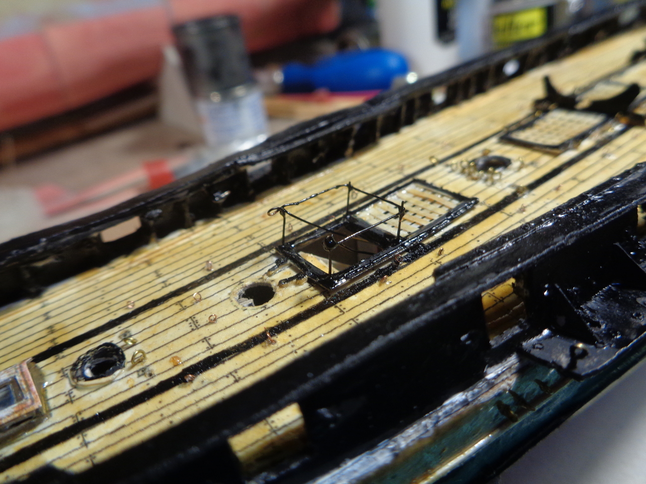 on voit ici qu'il y a un autre cadre collé sur le pont. À gauche, un caillebotis est posé dessus et à droire, le cadre attend son futur caillebotis. Ça fait un relief suffisant et discret. La barre marron fait partie de ce qu'il faut oublier (deux fois trop gros!)