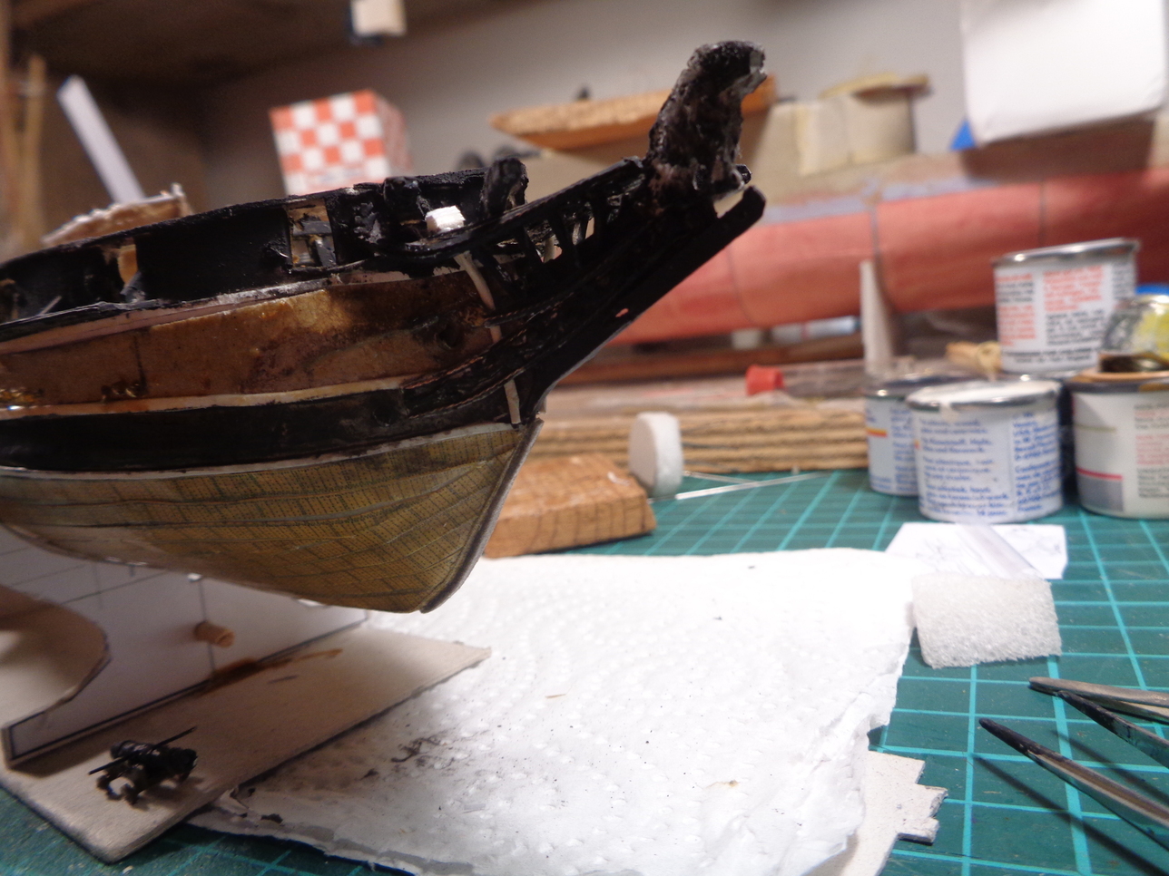 Voici une vue de l'avant, avec le recouvrement. On note que le sabord manquant a été percé mais que les bossoirs ne sont pas encore au bon emplacement. J'ai commencé à mettre de l’essuie tout encollé sur la figure de proue. Les anneaux sur la coque auraient du attendre que j'en sois aux mâts. J'ai du en ajouter plus tard pour qu'ils soient à la bonne place. Si on a bien construit la coque et implanté les mâts, le dessin est bon, ça marchera. mais comme je n'ai même pas collé les coupes sur la quille, il y a des décalages. De même il était prématuré de mettre les anneaux dans le pavois pour les canons. On verra avec l'artillerie qu'il est bien plus facile de faire autrement.