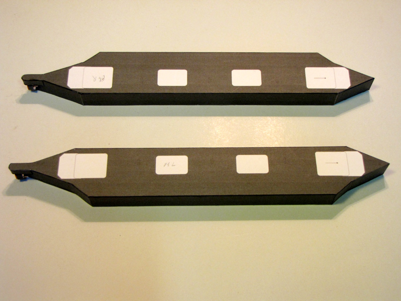 à gauche tourelles et cabines assemblées, à droite flèches découpées au laser :